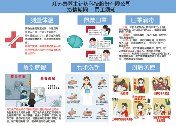 復工就是穩就業,復產就是穩經濟。如何能夠既防得了疫情,又保證人心穩定,安全復工,就成了擺在泰慕士面前最現實的問題。疫情發生后,公司迅速成立防控指揮部,緊急制定防控機制和應急預案,從人員健康管理、交通防護、就餐防護等方面都作出了明確要求,根據疫情發展情況,不斷升級和完善防控措施。并且,公司嚴格部署四級防控管護措施,從管理層到部門、班級、小組,明確責任人、層層落實、嚴防嚴控,統籌做好防疫相關工作。