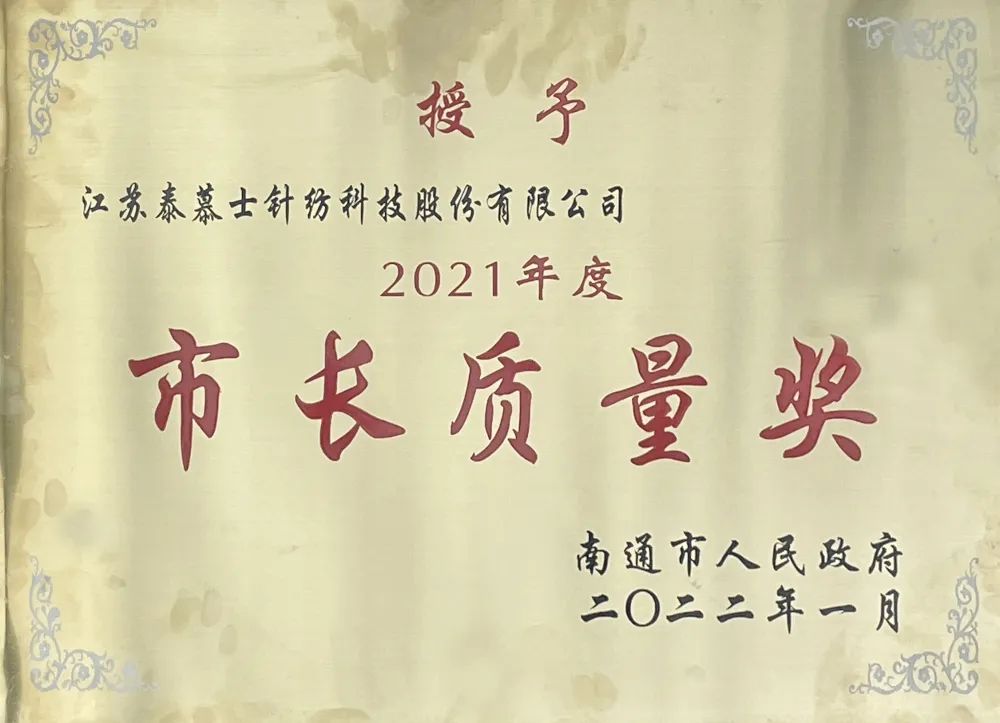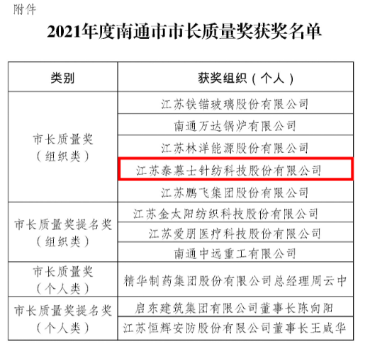 日前,南通市人民政府正式發布《市政府關于授予2021年度南通市市長質量獎的決定》,江蘇泰慕士針紡科技股份有限公司榮獲南通市“市長質量獎”。