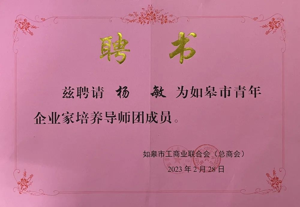 喜報丨楊敏總經理被聘為如皋市青年企業家培養導師