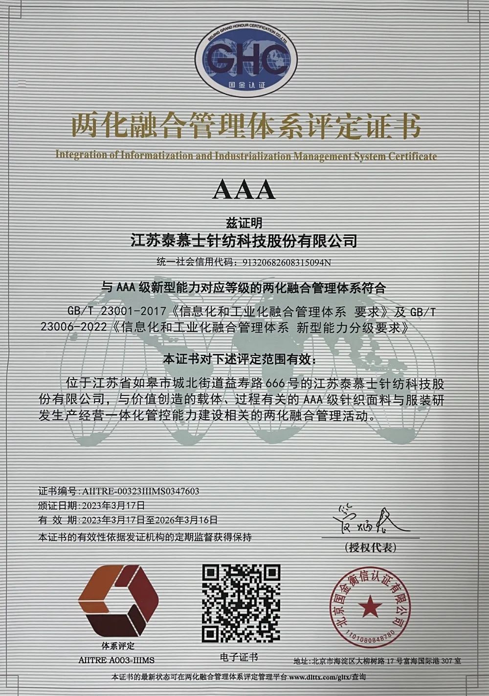 泰慕士順利通過工信部兩化融合管理體系評定工作委員會認定,取得兩化融合管理體系最高等級——AAA級認證,標志著泰慕士在推進信息化和工業化深度融合方面取得長足進步,并獲得最權威認可,成為如皋首個通過兩化融合管理體系AAA級評定的企業。