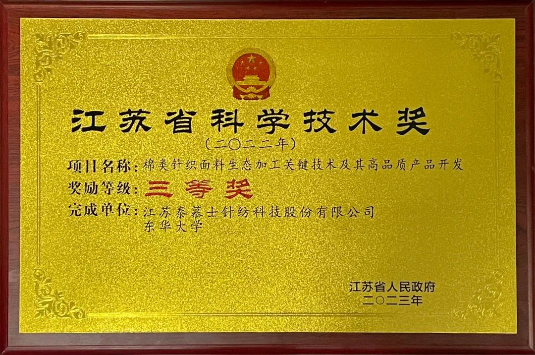 據悉,江蘇省科學技術獎是省科技領域的重磅獎項,是檢驗科技賦能產業發展的“試金石”。此次獲得省科學技術三等獎的項目是泰慕士與東華大學合作展開的“棉類針織面料生態加工關鍵技術及其高品質產品開發”項目。目前市場上80%以上的休閑、運動裝是針織面料制成的,但針織行業仍面臨許多瓶頸問題。針對這些問題,泰慕士和東華大學聯合建立棉類針織面料生態加工關鍵技術及其高品質產品開發項目組。經過10多年基礎研究和產學研聯合攻關,奠定了棉型針織物一浴連續前處理、無鹽染色、滌/棉混紡織物短流程生態染色,高品質熱濕舒適針織產品開發領域的領先地位,引領了我國針織物生態染整生產、熱濕舒適性針織物開發應用技術進步和產業升級,具有顯著的社會效益和示范、導向作用,經專家鑒定意見和科技查新咨詢結論“項目總體技術達到國際先進水平”。