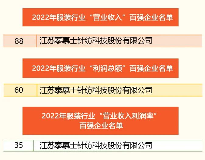 2022中國服裝行業百強企業,根據“會員參與、自愿申報”的原則,經各地方服裝協(商)會初審推薦,中國服裝協會分別對申報企業的“營業收入”、“利潤總額”和“營業收入利潤率”三項指標進行核實排序。此次泰慕士3項指標全部上榜,分列第88位、第60位、第35位。