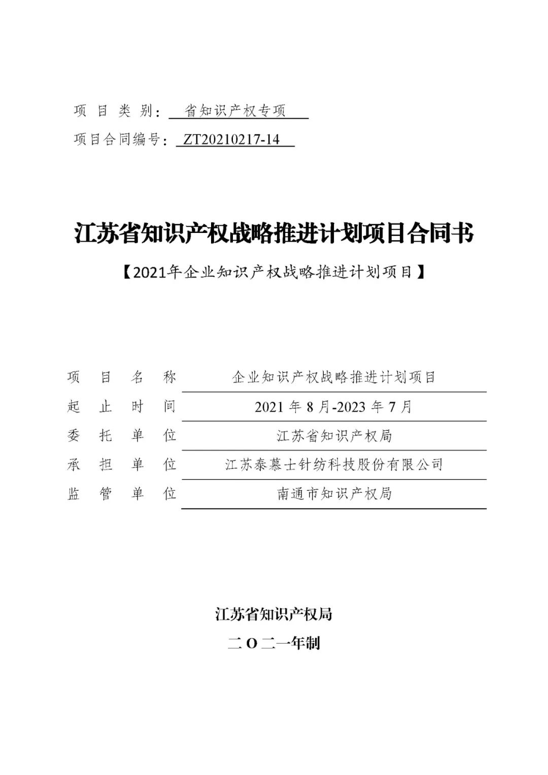 近年來,泰慕士始終堅持“科技創新是第一動力”的工作重點,加快實施創新驅動發展戰略,高度重視知識產權建設,2021年,公司承擔江蘇省知識產權戰略推進項目,通過構建高效的企業知識產權管理運行機制,全面落實知識產權激勵政策,多渠道、多舉措促進知識產權示范構建,提升知識產權管理能力,推進知識產權工作有序開展,促進形成了一大批支撐品牌發展的具有自主知識產權的核心技術。