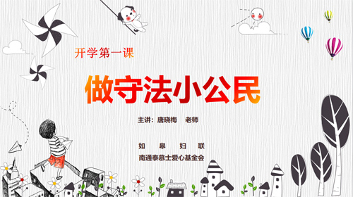 經過一個特殊的加長版寒假后,孩子們即將回到闊別已久的校園,如何把疫情變成教材,把困難化為動力,讓孩子們構建科學的世界觀、人生觀和價值觀。今天特別邀請了基金會的娘家人,從事幼兒教育27年,如皋市婦聯唐曉梅老師為大家上一堂別開生面的開學第一課——“做守法小公民”。
